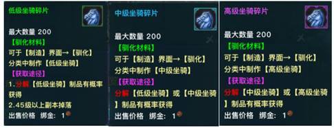坐骑驯化系统为玩家提供了免费获得坐骑的途径。在驯化界面消耗流通金与坐骑碎片即可制造出酷炫的永久坐骑。低级坐骑碎片可通过击杀45级以上副本BOSS掉落。中级坐骑碎片、高级坐骑碎片可通过分解制造坐骑获得。