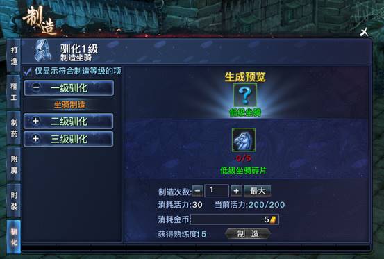 多次制造积累熟练度,即可解锁更高等级的坐骑驯化功能,驯化更高级的强力坐骑。