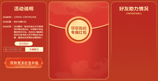 答:您需要邀请新老好友进行助力,获得高额红包金额;也可在【贺岁内测大区】开服后,完成游戏目标,领取更多红包金额。