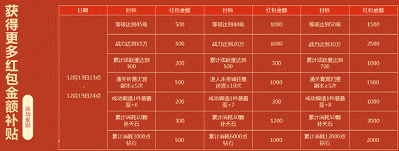 3.12月13日13点【贺岁内测大区】开服后,完成游戏任务还能增加大额红包金额。等级/战力达标、通关副本、累计活跃度达标、锻造装备等达成目标,海量红包金额等你来拿!