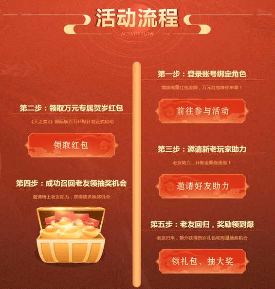 1. 活动期间,新老玩家在本页面登录并绑定角色后,可领取不同金额的贺岁红包。发送自己邀请码给好友请求助力还可增加红包金额,邀请老玩家增加金额更高!