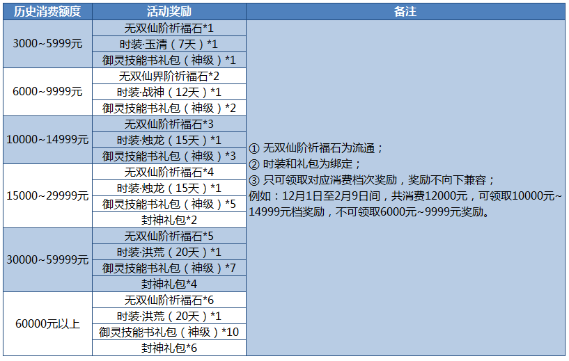 活动内容:截止2019年12月1日至2020年2月29日,历史消费满3000元及以上的,即可领取无双仙阶祈福石!(根据历史消费情况查询【全球跨国大区】共需发放40个无双仙阶祈福石)
