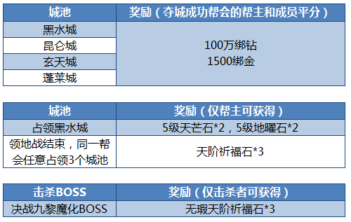 C. 凡领地战结束后,同一个帮会战力3座城池或以上(不包含联盟帮会),帮主可额外获得天阶祈福石和九天石,奖励为流通