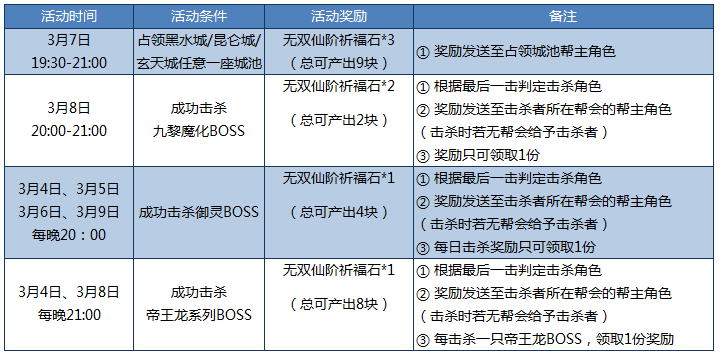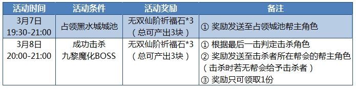 活动内容:活动期间内,参与领地战、决战九黎魔化BOSS,完成指定条件,即可领取无双仙阶祈福石!