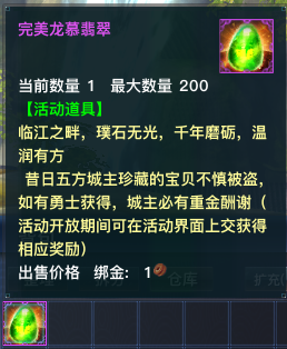 除了野外地图打宝之外,本次淘金新版,还新增了一个打宝专属地图——“宝藏洞”,传说只要击杀遍布宝藏洞的可疑盗宝贼,即可掉落【城主的宝藏】,其中特产一种神秘的道具【龙慕翡翠】,递交悬赏即可获得流通钻石!